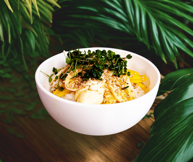 Riz rond blanc, crème d’amande*, huile de coco*, Sucre vanillé* ou vanille*, dés de mangue et banane*, graines de sésame*, micropousses de roquette*