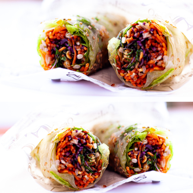 Rouleaux végétaux frais, garnis de salade croquante, carottes râpées, chou blanc mariné (huile de sésame*, shoyu*, vinaigre de riz), graines de tournesol* & sésame*, gingembre, micropousses* (radis, roquette, brocoli, pois). Une base saine et gourmande, la signature Koumaï